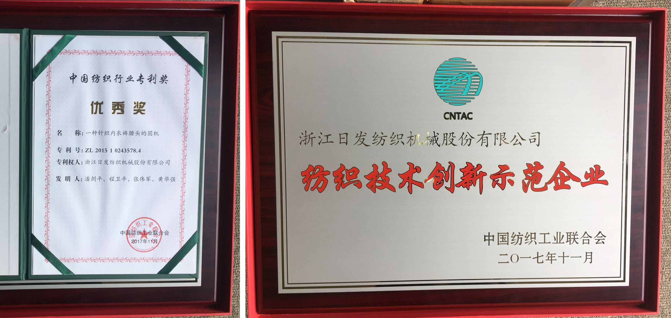 12月18日,“紡織之光”2017年度中國紡織工業聯合會科技教育獎勵大會在北京人民大會堂隆重召開。中國紡織工業聯合會黨委書記兼秘書長、紡織之光科技教育基金會理事長高勇;中國紡織工業聯合會會長孫瑞哲,原會長杜鈺洲、王天凱;中國棉花協會原會長林乃基、中國紡織工業聯合會副會長楊紀朝、夏令敏等行業領導出席大會并為獲獎企業代表頒獎。日發紡機在此次表彰大會中榮獲多個獎項:浙江日發紡織機械股份有限公司獲“紡織技術創新示范企業”;日發紡機董事長何旭平獲“全國紡織科技創新創業人才”;日發紡機“一種針織內衣褲腰頭的圓機”專利獲”中國紡織行業專利獎優秀獎“。