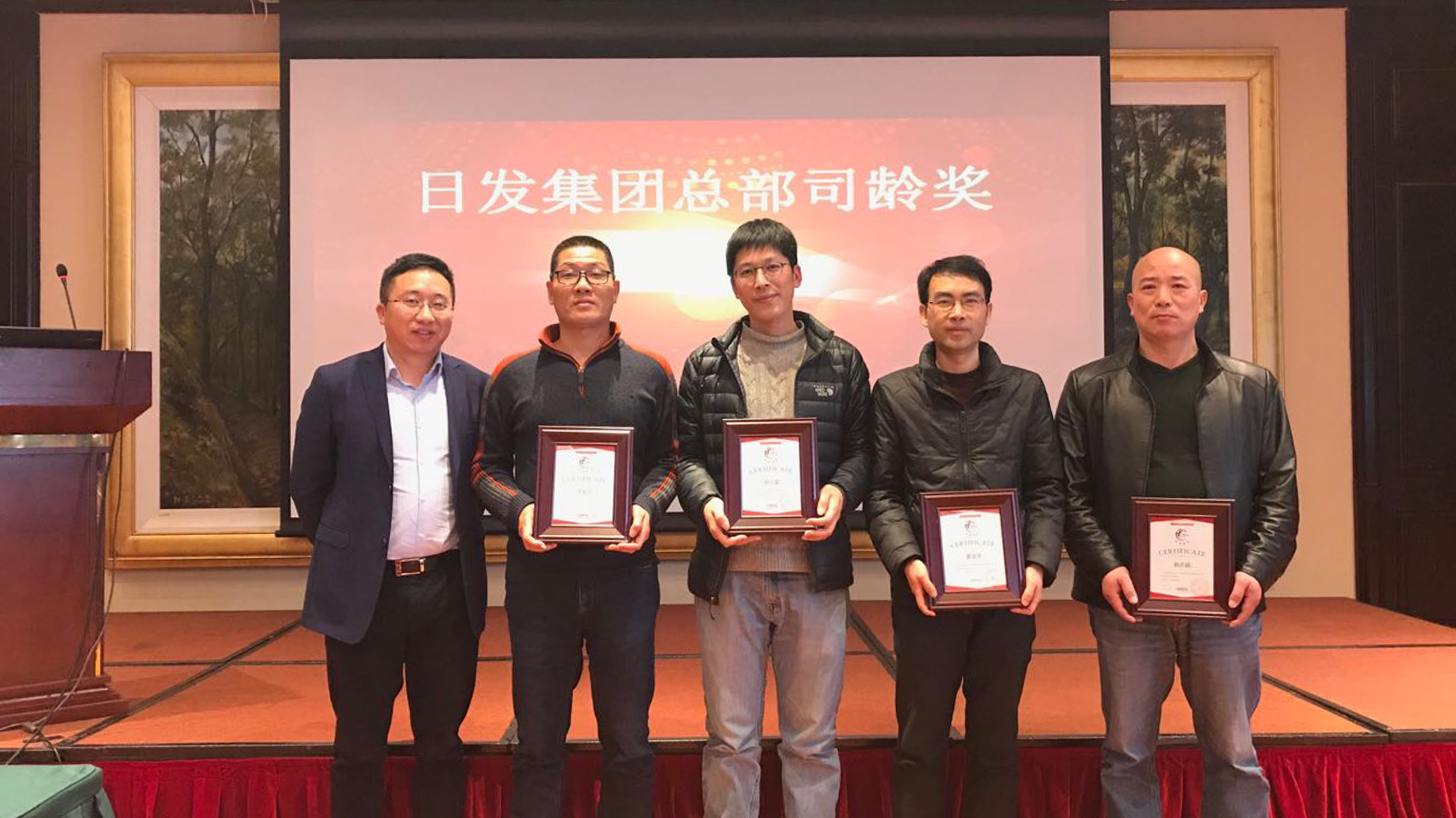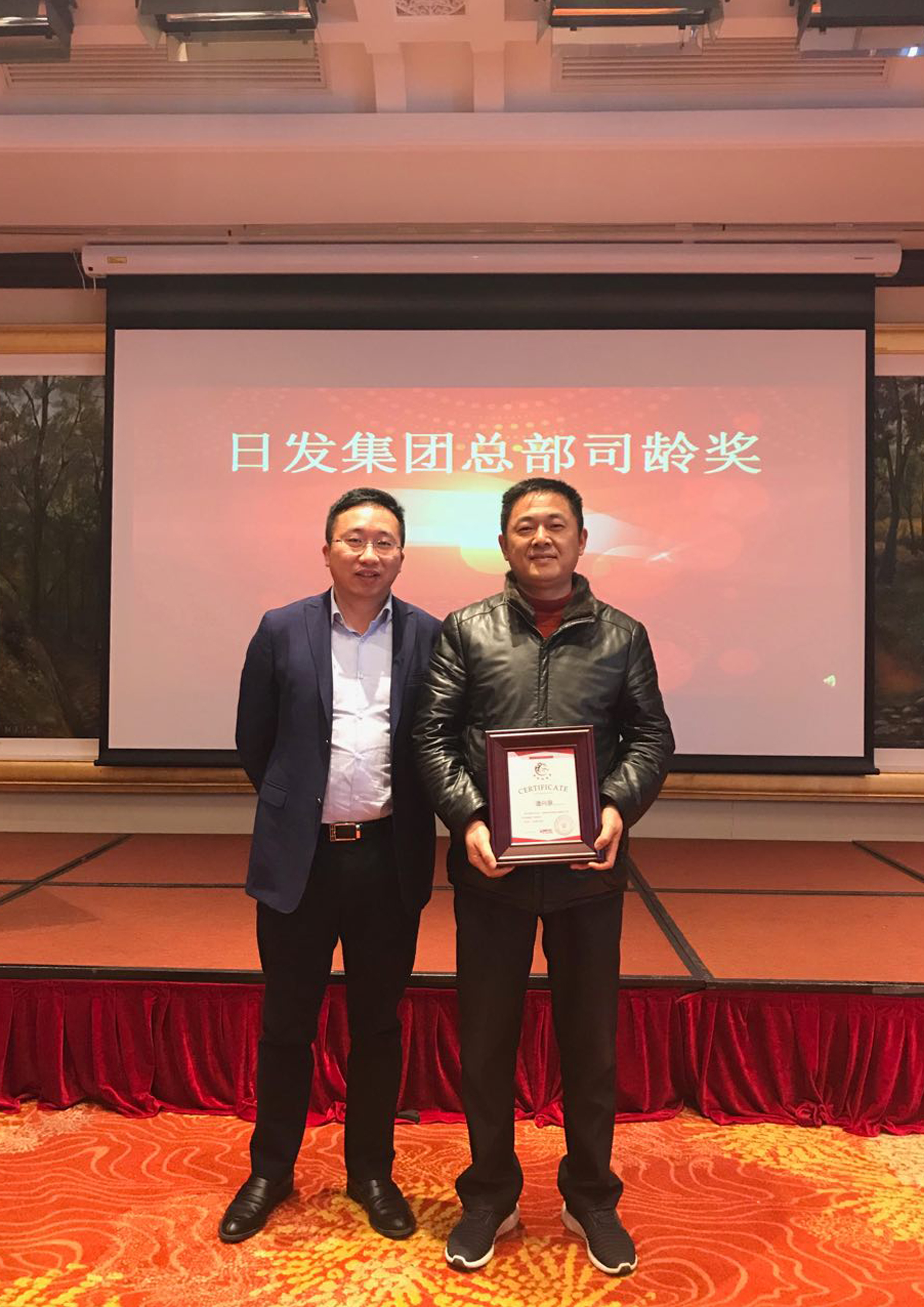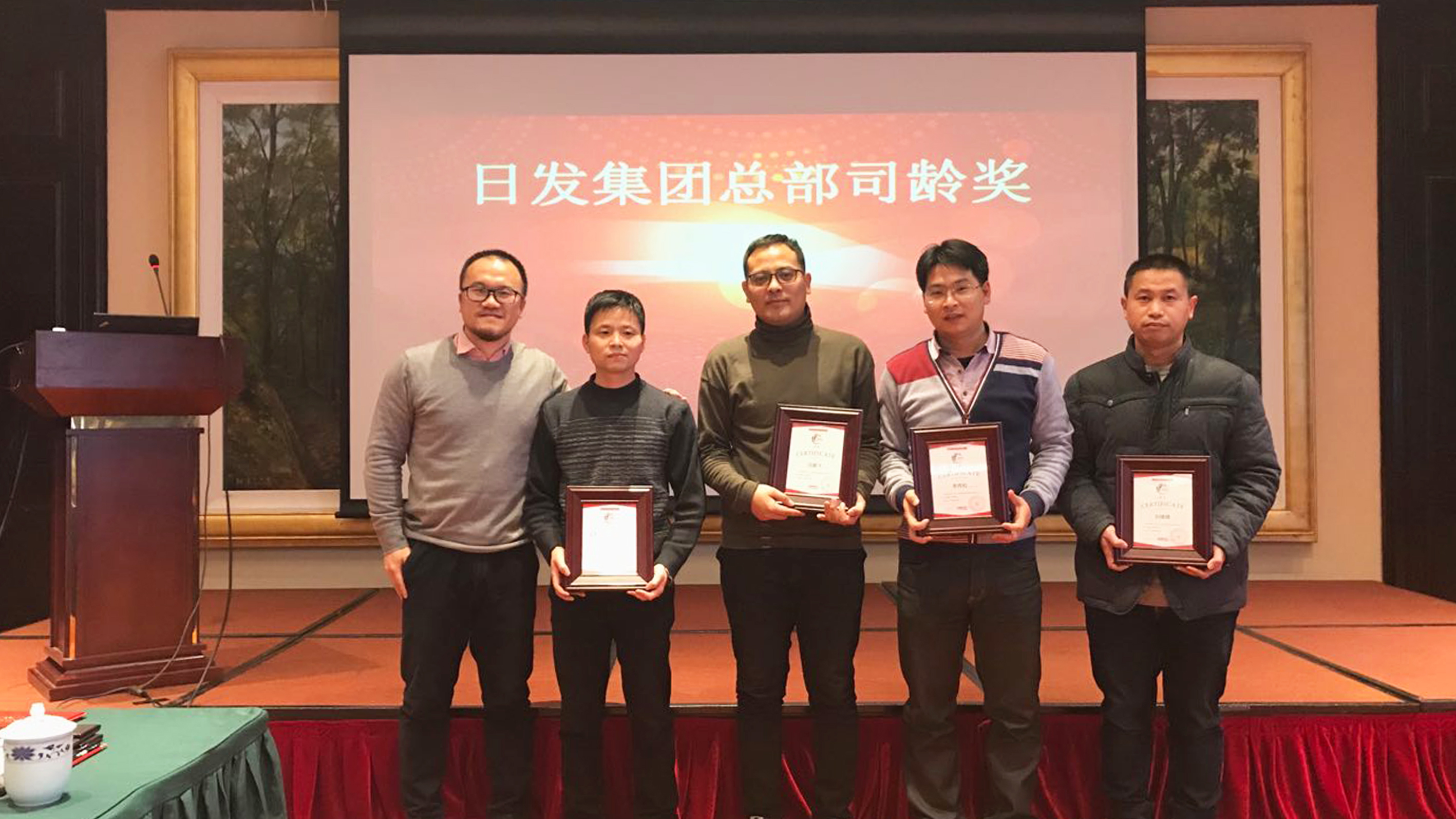 議程第四項,頒發司齡獎。司齡獎——日發騏驥獎是集團總部新設立的獎項,表彰司齡5年以上的員工,按年限分5級,感謝他們為集團的長期發展作出的卓越貢獻,日發集團的成長離不開他們不舍的羈絆和不懈的努力。老員工代表許金開發言,深情回顧了初入社會時的自己和日發,從懵懂牛犢相伴成長為成熟堅毅日發人,日發也成了一顆參天大樹。他由衷感謝祖國創造了一個好時代,感謝日發讓他發揮了人生的價值。