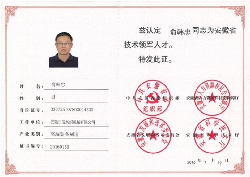 根據安徽省人力資源和社會保障廳《關于做好第五批安徽省戰略性新興產業技術領軍人才評選工作的通知》(皖人社秘〔2016〕121號)文件精神,安徽日發紡機推薦了紡紗技術部俞韓忠參與評選。憑借十余年行業研發工作經歷、突出的科研管理能力和團隊組織領導能力以及22項專利證書、轉杯紡產品線升級項目成功經驗等多項具有國內外先進水平的研究成果,俞韓忠順利通過安徽省委組織部、省人力資源和社會保障廳、省發改委、省科學技術廳專家評審、實地考察等程序,入選第五批“安徽省戰略性新興產業技術領軍人才”并頒發榮譽證書。