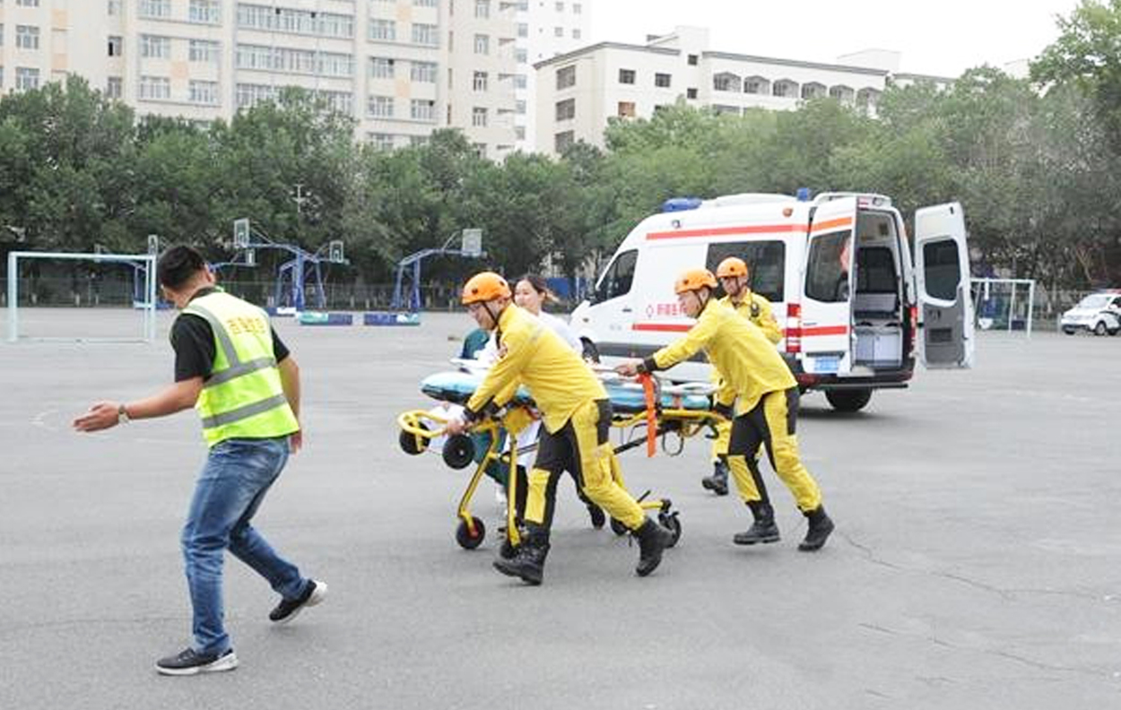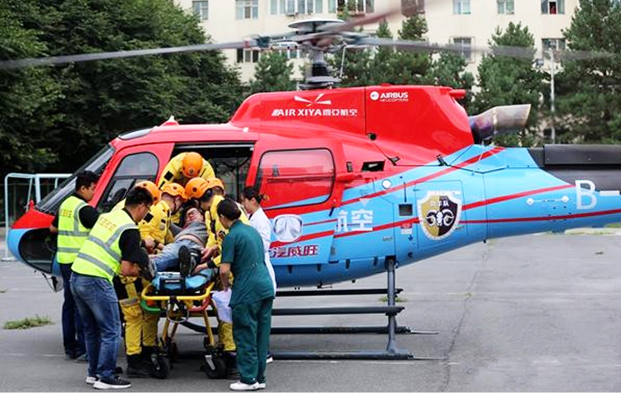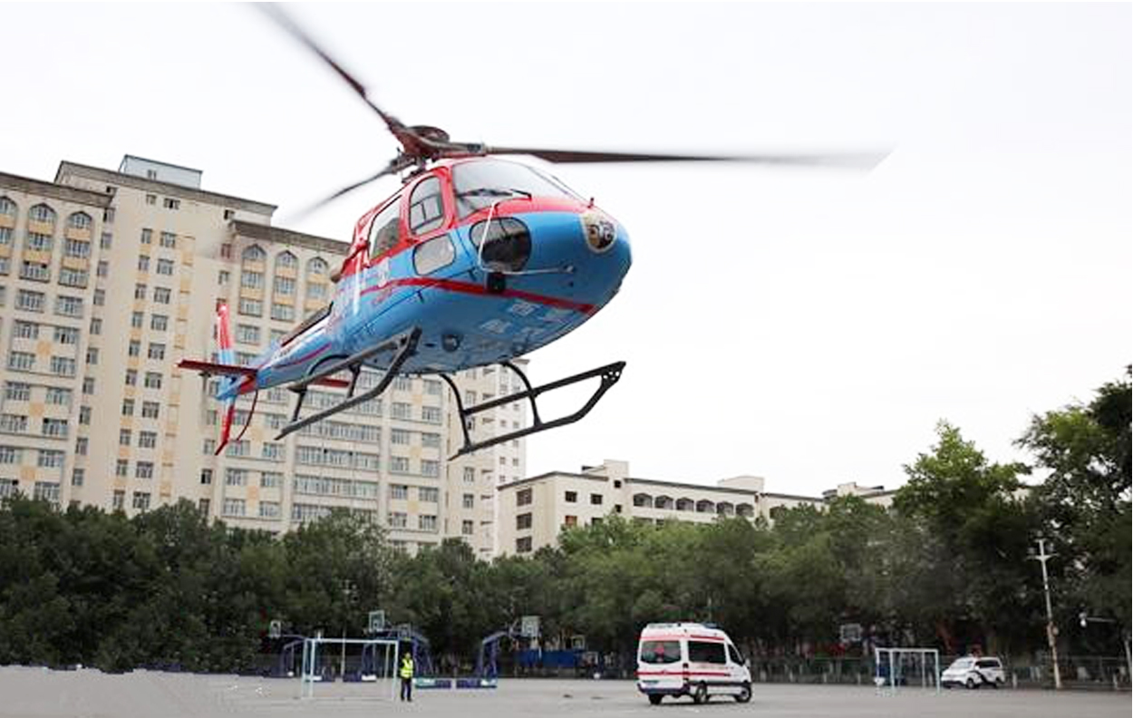 8月21日上午,隨著一陣直升機的轟鳴聲,西亞航空運營的新疆地區首架H125直升機落在了新疆醫科大學第一附屬醫院籃球場上。一支訓練有素的急救隊伍迅速向直升機靠攏,一位腿腳骨折并失血較多的“病人”從打開的艙門中被救援隊員抬下飛機。在降落地點緊急待命的一附院醫護人員接到“病人”后迅速將其送往急救中心救治。這是一場由新疆地區首家直升機商務運營企業——西亞直升機航空有限公司與民間救援專業團體——烏魯木齊公羊救援協會,在新疆醫科大學第一附屬醫院協助下聯合舉辦的新疆地區首次空中救援演練活動。